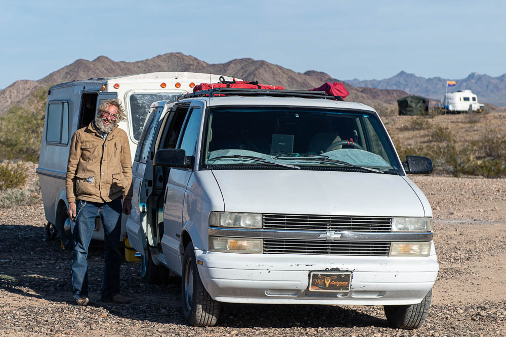 What a difference a day makes here at Quartzsite. 84°F yesterday, 49°F this morning & 15 - 25 MPH wind. The high for the day was at midnight at 69°F. While you can still see the near by mountains, the distant ones have disappeared in the dust. On my morning walk I found a group of new arrivals that were huddled around a propane firepit. At least one trailer owner packed up an left this morning.