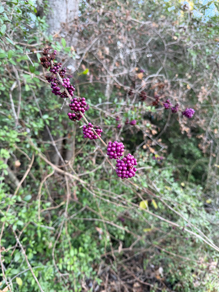 While cool this morning, it is warming up, 75°F at 1:00. So far the MAXX fan is keeping the trailer livable but it it gets much warmer inside I'll have to run the AC to keep my medicine under 80F. I moved outside to read. While reading an armadillo came by for a visit. Kind of neat; you don't see too many of them in upstate NY, but they go along with the turkey vultures for appeal. I also found some of the purple berries that I only seem to find here in Texas.