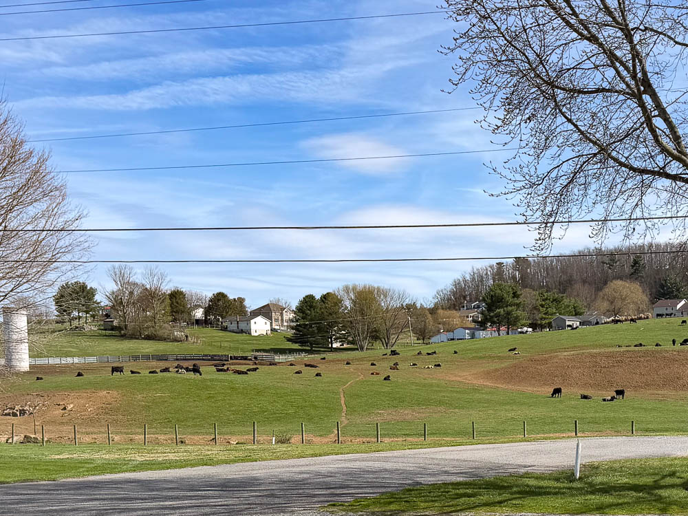 Most of the drive was on I 81. Busy, but no stopped traffic. I arrived at Fort Chiswell RV Park around 1:30. I'm in site 10, just big enough for the truck & trailer. 1/2" off side to side & I had to lower the tongue 2". The site is a pull through full hookup on gravel with a picnic table. I'm here for 4 nights at $60.00 per night with a Good Sam's discount. Lots of cows on the hill behind me.