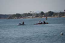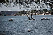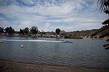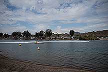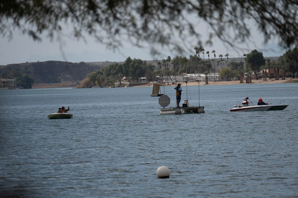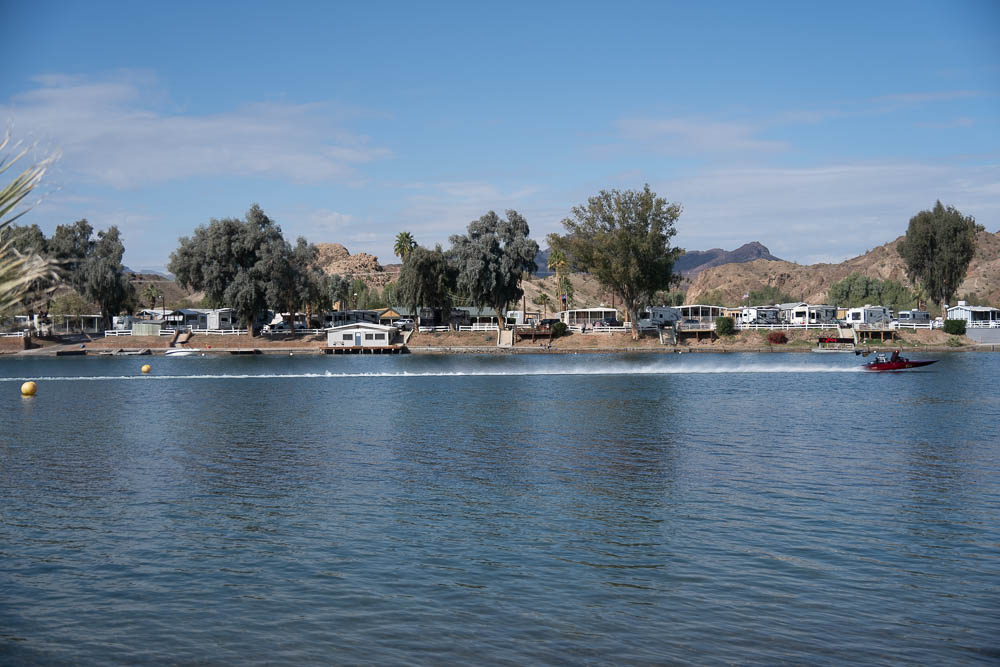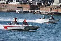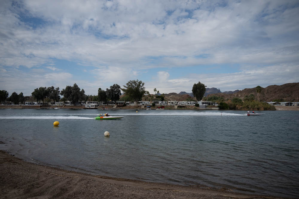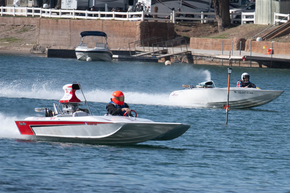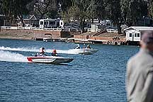Around noon I walked back to the Pirates Den park (south of the La Paz park & the location of the Black Pearl Restaurant) to watch some of the qualifying runs of some of the boats. Sort of like watching paint dry - a long time between runs, but I stayed for a few photos. While the boats sometimes get as far up the river as my trailer, they are coasting by then. The start is at the restaurant, and the length of a run is 660', 1000' or 1320' depending on class. It looks like they are doing the shortest run today since I was well into the Pirates Den park to take these photos & for most of them I was at the finish line.