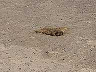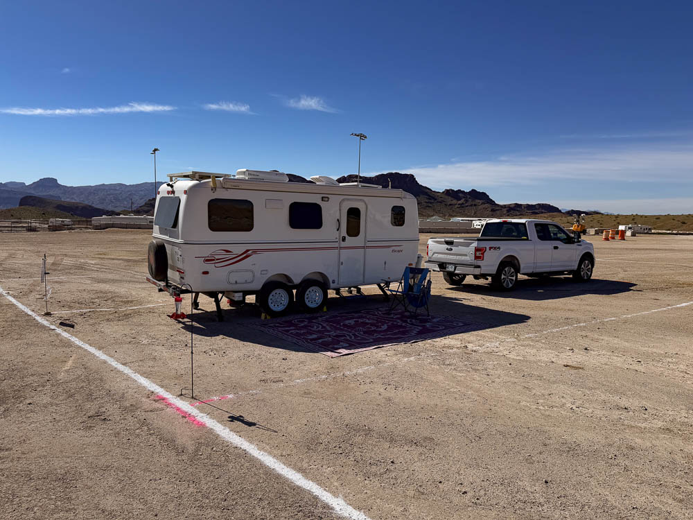 I headed out around 11:30. No line at the dump station, and no one behind me. An uneventful 11 mile drive to the rodeo grounds. I'm in B22, a dry 20' X 40' section of a parking lot for a week. A $250 donation to the Sara Rodeo Grounds for 7 nights or $35.71 per night. I had to raise one side 2 1/2" and drop the tongue 3". You best be comfortable with a horsey smell since there are horse droppings all over the parking lot. The ground is very hard - Tough to stake down the mat & I had to use a tent stake to drill holes for the hummingbird feeder & the camping sign.