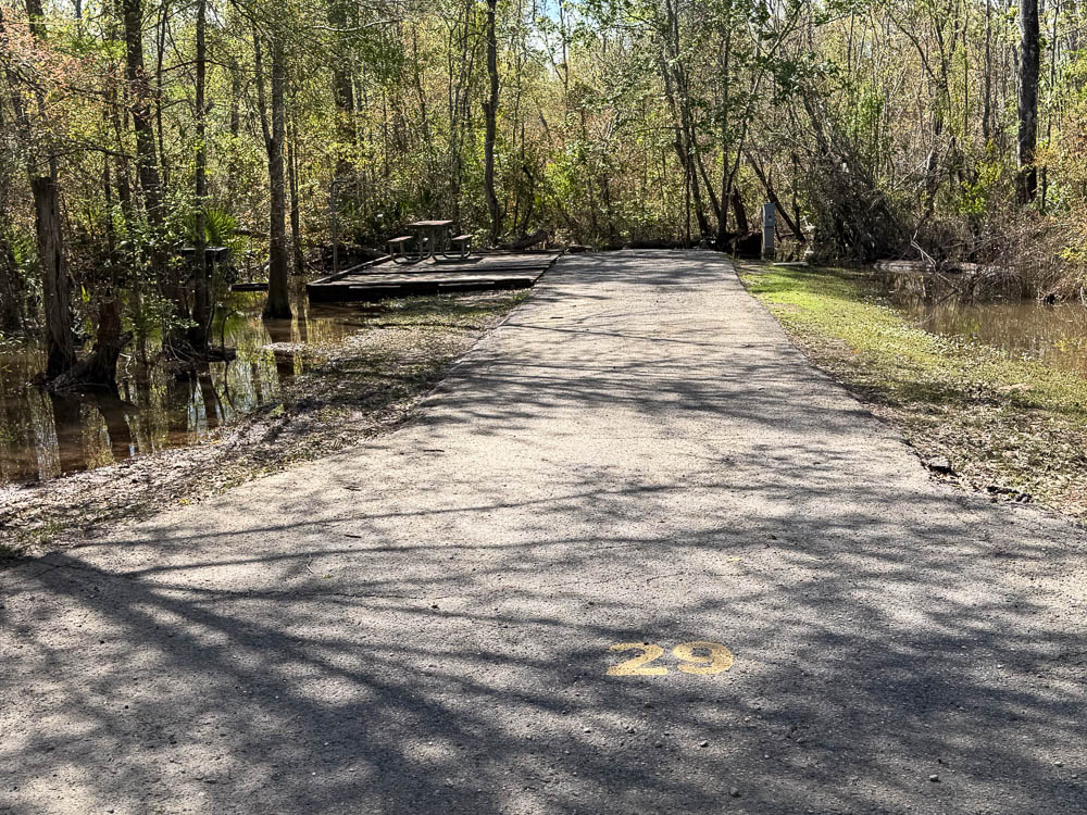 I reached Tickfaw State Park at 2:15, and was assigned site 8. I walked around the electric loop and some of the sites were underwater. The pavement at my original site (29) was dry, but looked like an island. Some were worse: