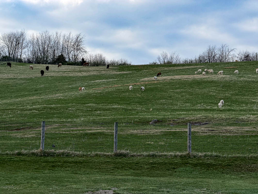 The cows are all lying down in the field behind me. On the hill in front is a herd of sheep and a few more cows: